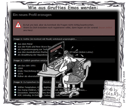 Da das Internet immer bevölkerter wurde begab es sich das gothic.at eine neue Registrierungsmethode einführte um ein wenig mehr Abstand zu Bots, Außenstehenden und Ähnlichem gewähren zu können. Diese bestand aus einem Fragebogen der tatsächliches Wissen über die Szene voraussetze um korrekt beantwortet werden zu können. Ich weiß bis jetzt nicht was ich amüsanter fand: die falschen Antworten oder das einige tatsächlich Probleme mit dem Test hatten.